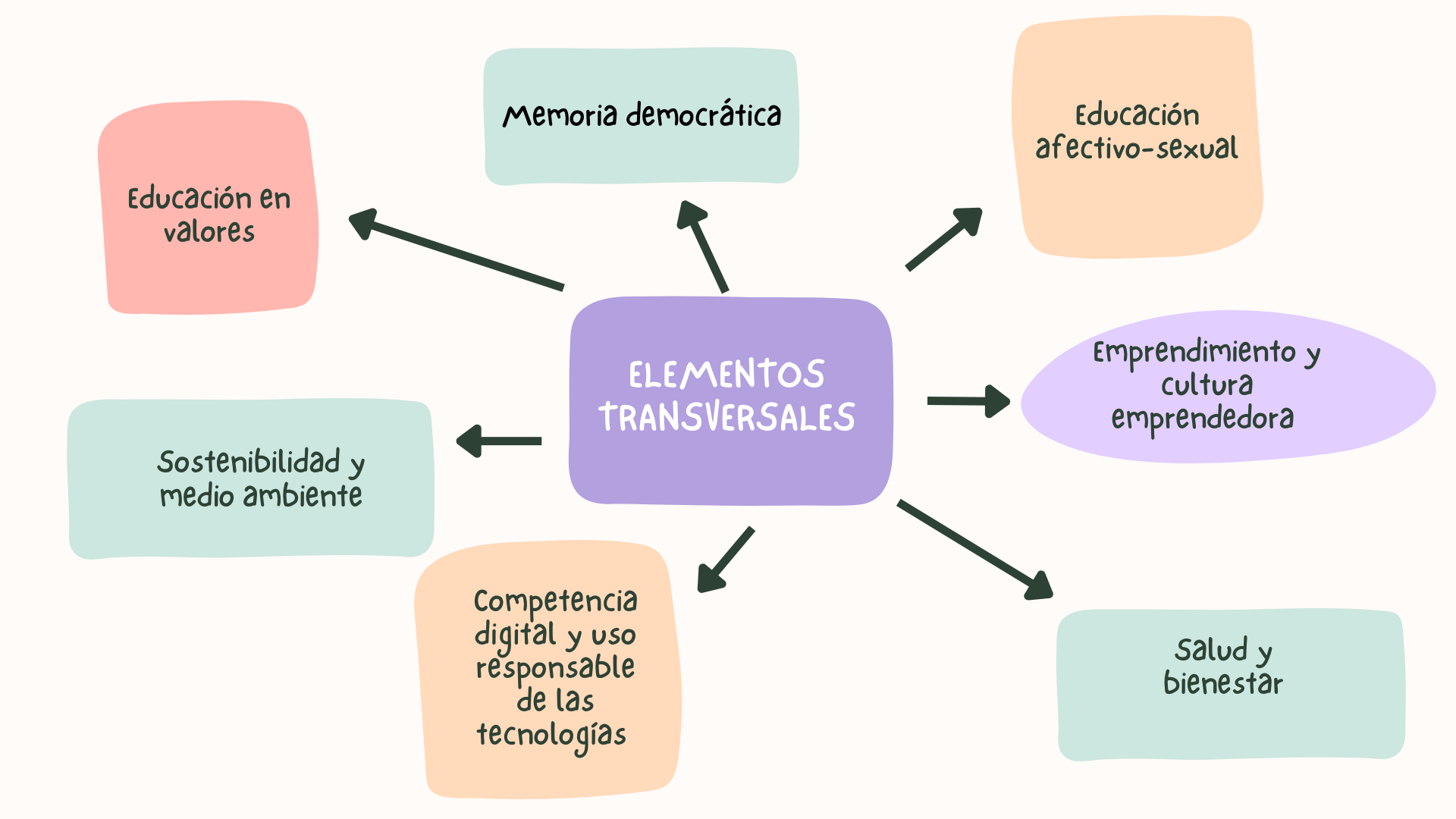 Para mayor comprensión de nuestro alumnado, en este esquema recogemos los principales elementos que deben ser abordados a lo largo de toda la etapa educativa con especial hincapié en la formación en igualdad de género, desarrollo sostenible, cultura para la paz y valores cívicos y éticos.